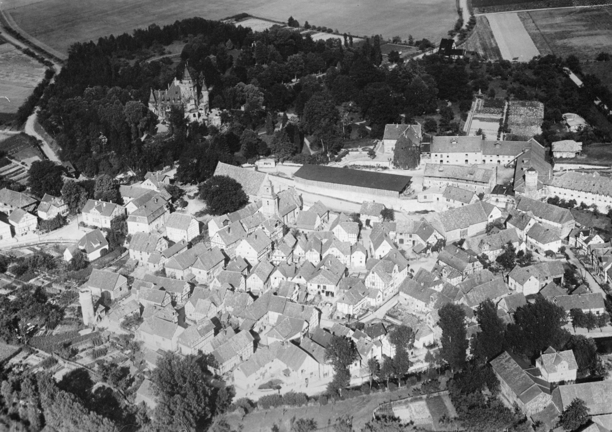 In den 1970-er Jahren erfolgten zahlreiche Gebietsreformen in Hessen, von der auch der Landkreis Waldeck betroffen war. Die Stadt Züschen wurde ein Ortsteil von Fritzlar im Schwalm-Eder-Kreis. Oben bzw. rechts ist Züschen aus der Zeit vor 1939 abgebildet (Quelle *10). Das "Schloss Garvensburg" ist links oben im Park zu erkennen und das "Rittergut Züschen" (heute schon seit Jahrzehnten nicht mehr betrieben) mit ihren großen Gebäuden weiter rechts vor dem alten Park mit dem früheren Friedhof. Und bei Vergrößerung des heruntergeladenen Ortsbildes ist hinter der rechten Ecke der langestreckten Remise auch das Verwaltergebäude (s. Bild weiter unten) zu erkennen, in dem die Haupt-Schalttafel aus dem Artikel "6. Die Haupt-Schalttafel des »Ritterguts Züschen« für den Strom aus der »Wilhelmsmühle«" hinter dem Fenster stand, auf welches der rote Pfeil zeigt.