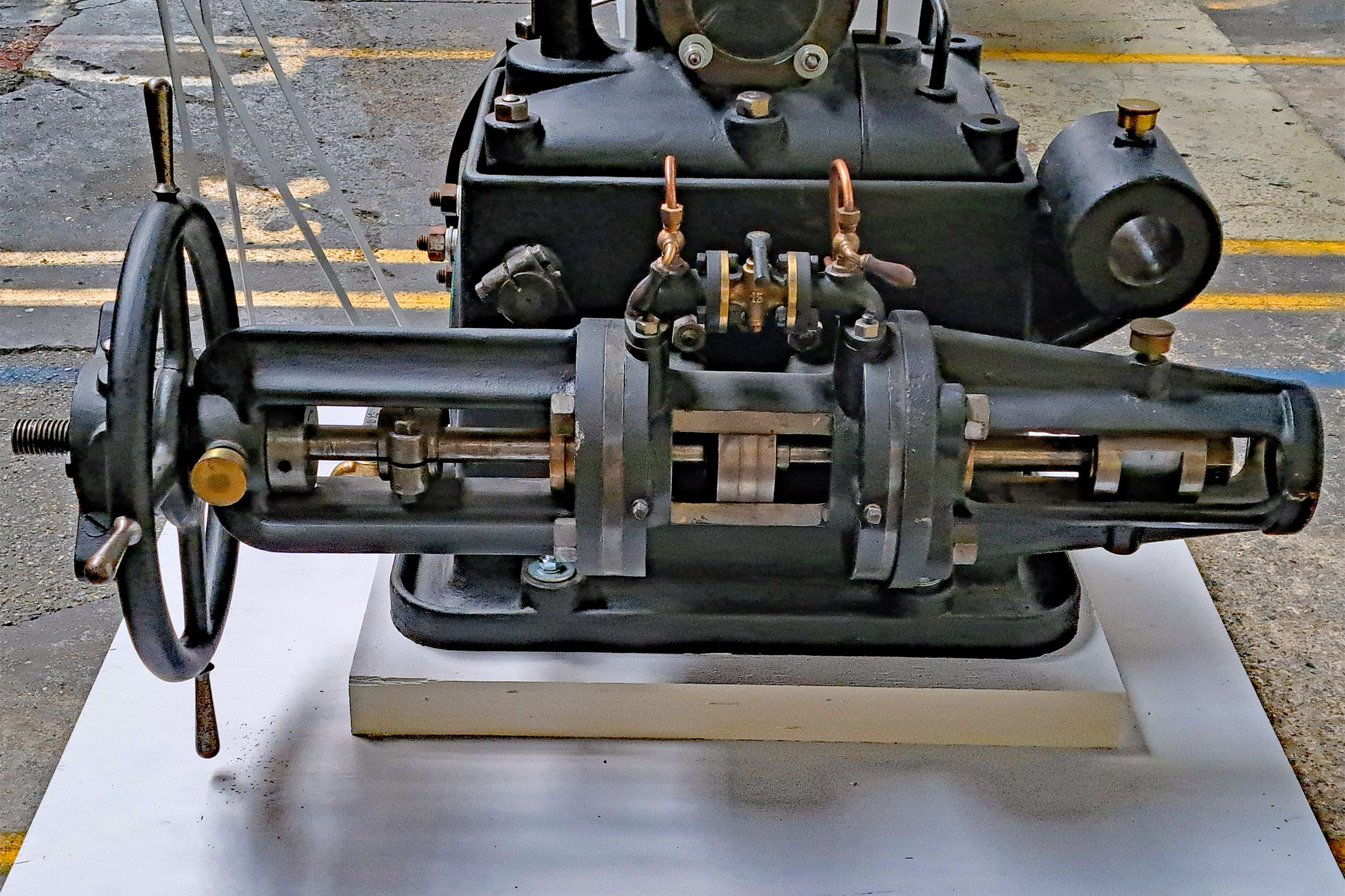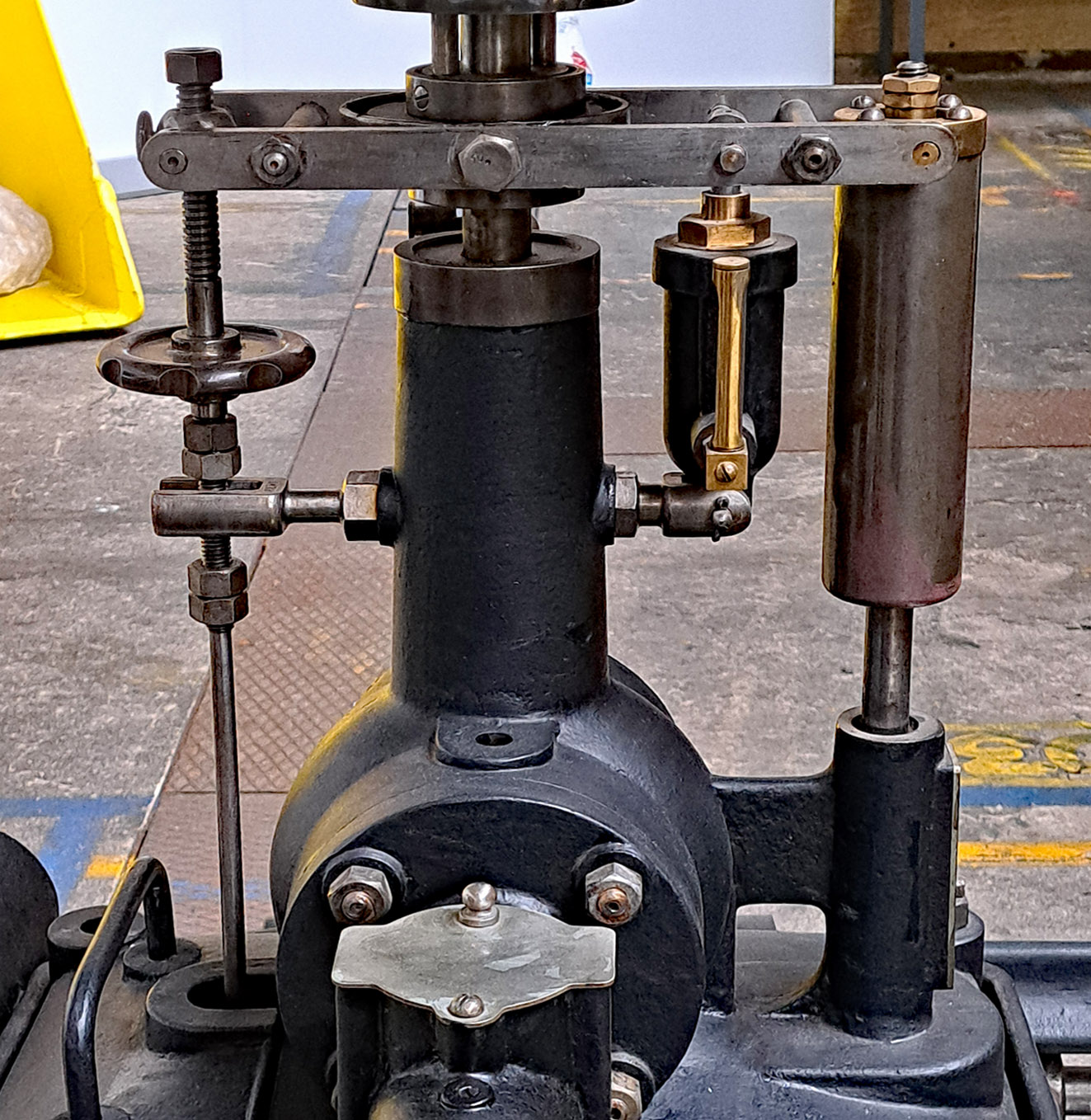 So ist das auch bei der wenige Meter, zwischen den Henschel-Werkzeugmaschinen und der Modelleisenbahn, stehenden Dampfmaschine "Lady Agnes" und prinzipiell auch der teilweise aufgeschnittenen AEG-Hilfs-Dampfturbine aus dem Kasseler Müllheizkraftwerk. Bei der Dampfmaschine wird die Drehzahl am großen Schwungrad abgenommen und über Riemen dem Fliehkraftregler zugeführt. Dieser verstellt am seitlich neben dem Dampfzylinder angeordneten Schieberkasten über die senkrechte Verbindung des Regler-Waagebalkens mit Zahnstange am unteren Ende die Dampffüllung des Zylinders und damit deren Leistung. Bei der Dampfturbine mit ihrer hohen Drehzahl über 7.000 Umdr./min. ist das schwieriger zu erkennen. Hier wird (vermutlich hydraulisch) ein Kolben gegen Federkraft verschoben und damit der Querschnitt des Dampfeintritts verstellt.
