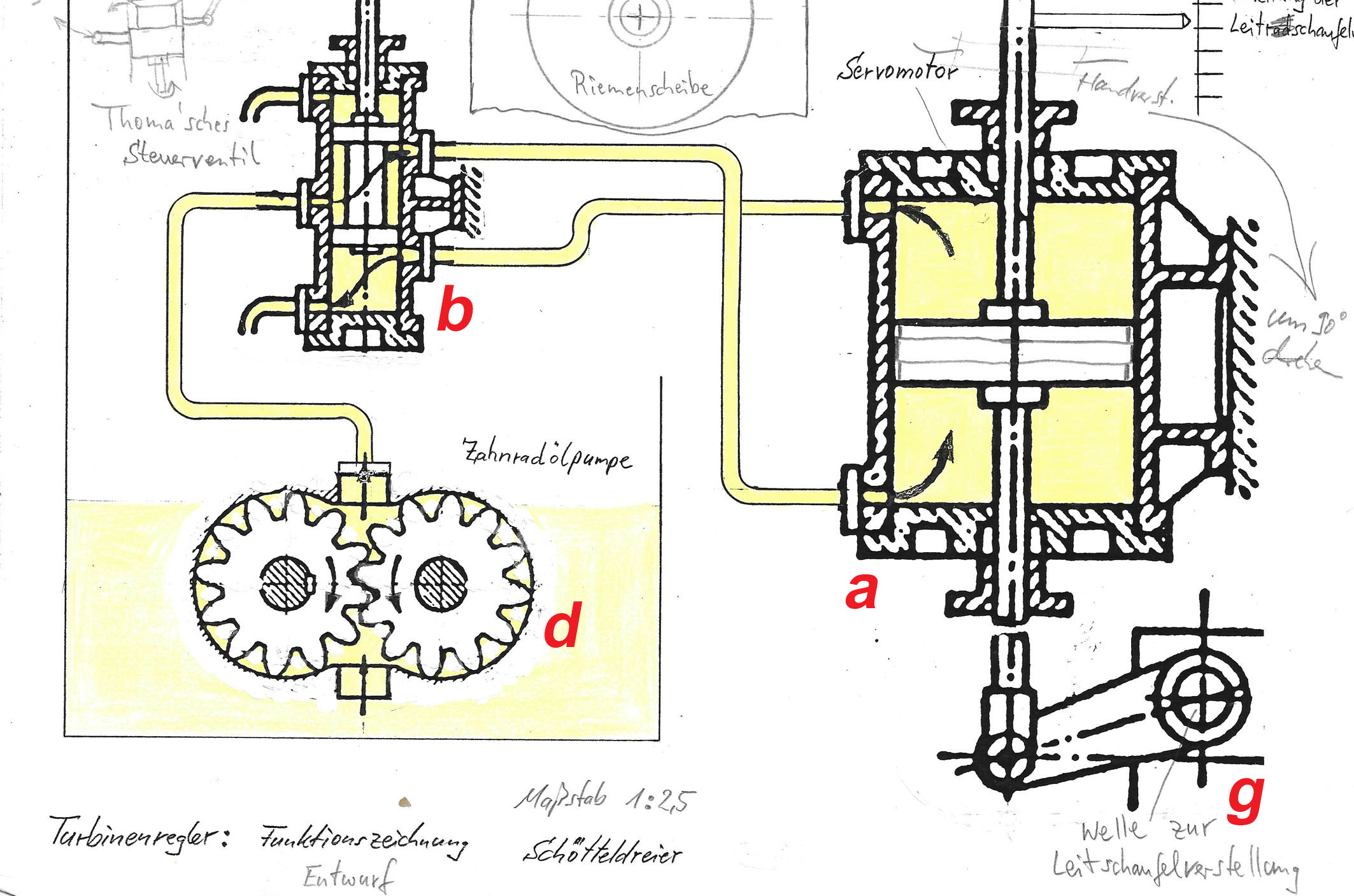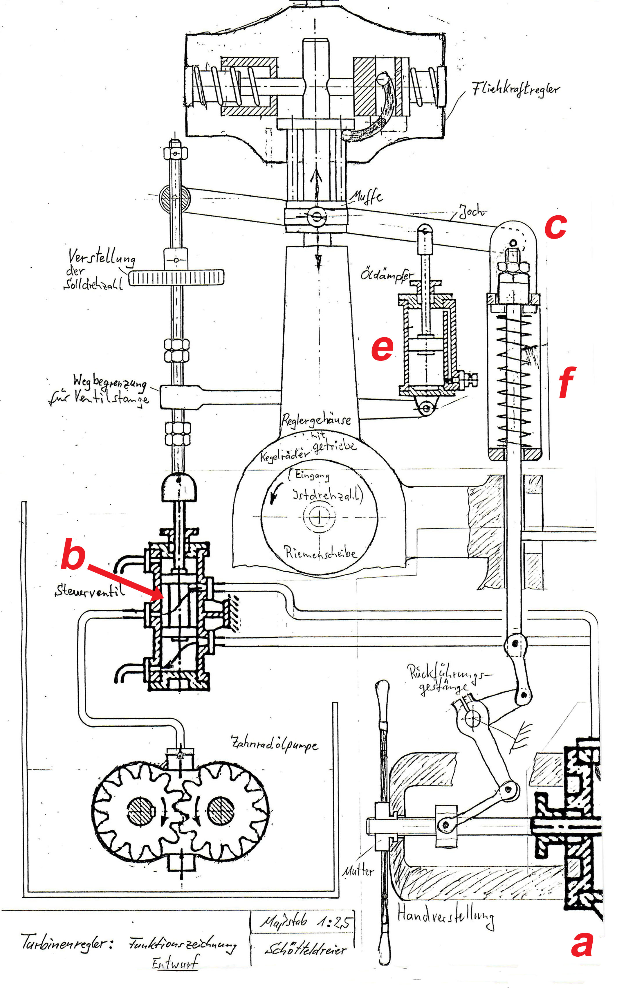 Die Anordnung und Wirkung des hydraulisch-mechanisch wirkenden Drehzahlreglers aus den erstem Jahrzehnten des 20. Jh. auf die zu regelnde Francis-Wasserturbine und damit einen sehr frühen Drehstrom-Generator wird wie oben beschrieben in mindestens einem, vielleicht auch zwei eigenen Artikeln in den nächsten Monaten erklärt.