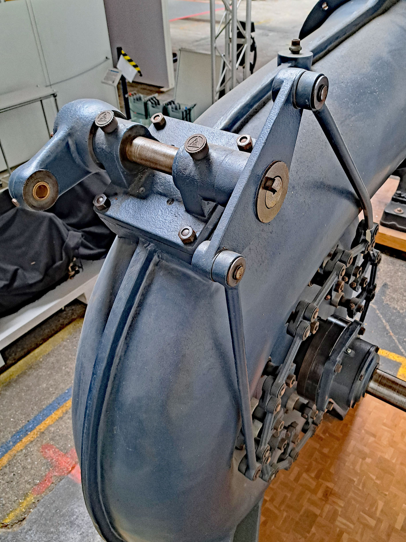 Der Blick auf die Verstellmechanik zeigt, dass zwölf Leitschaufeln gleichzeitig zu verstellen sind. Dies bedeutet auch Wartungsaufwand: Es muss geschmiert werden, alle Befestigungen sind zu überprüfen, der Maschinist hatte gut zu tun!