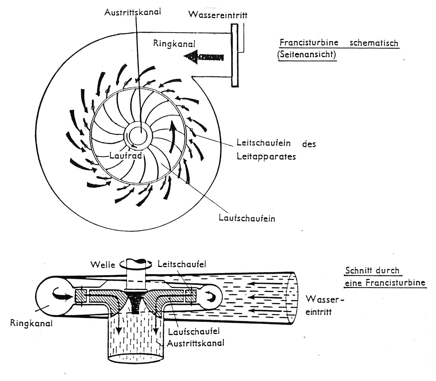 Dann durchläuft es dieses radial, d.h. von außen her zum Mittelpunkt, wobei es durch die gekrümmten Schaufeln umgelenkt wird (Radialturbine). In der Mitte verläßt das Wasser die Turbine nahezu im rechten Winkel zur Einlaufströmung und gelangt durch den Saugschlauch in den Untergraben. Die Einlaufspirale soll für eine möglichst wirbelfreie Zuströmung des Druckwassers sorgen und so den hydraulischen Wirkungsgrad (ein Maß für die Ausnutzung der Wasserströmung) verbessern. Ihre Form mit der zunehmenden Querschnittsverkleinerung ergibt sich aus der Überlegung, daß das zulaufende Wasser rings um die Turbine jeweils um den Betrag abnimmt, der zwischen zwei Leitschaufeln dem Laufrad bereits zugeflossen ist.