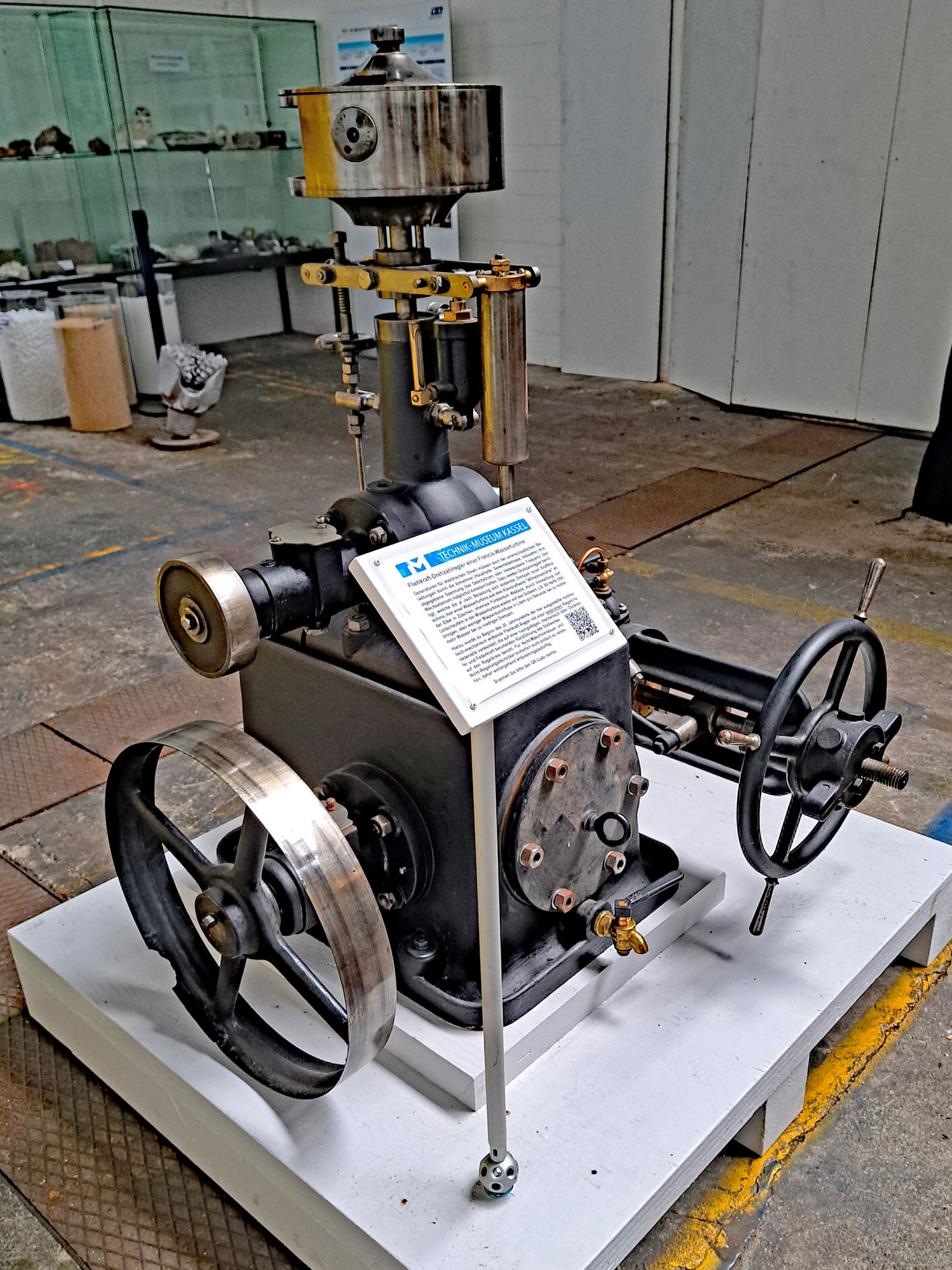 So ist das auch bei der wenige Meter weiter, zwischen den Henschel-Werkzeugmaschinen und der Modelleisenbahn stehenden Dampfmaschine "Lady Agnes" und prinzipiell auch der teilweise aufgeschnittenen AEG-Hilfs-Dampfturbine aus dem Kasseler Müllheizkraftwerk. Bei der Dampfmaschine wird die Drehzahl am großen Schwungrad abgenommen und über Riemen dem Fliehkraftregler zugeführt. Dieser verstellt am seitlich neben dem Dampfzylinder angeordneten Schieberkasten über die senkrechte Verbindung des Regler-Waagebalkens mit Zahnstange am unteren Ende die Dampffüllung des Zylinders und damit deren Leistung. Bei der Dampfturbine mit ihrer hohen Drehzahl über 7.000 Umdr./min. ist das schwieriger zu erkennen. Hier wird (vermutlich hydraulisch) ein Kolben gegen Federkraft verschoben und damit der Querschnitt des Dampfeintritts verstellt.