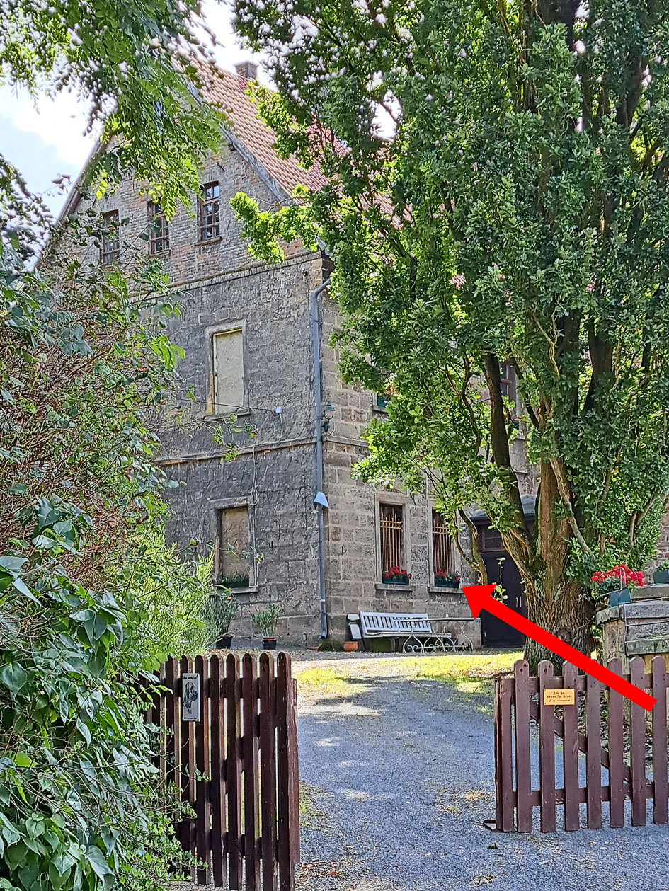Oben bzw. rechts ist Züschen aus der Zeit vor 1939 abgebildet (Quelle *10). Das "Schloss Garvensburg" ist links oben im Park zu erkennen und das "Rittergut Züschen" (heute schon seit Jahrzehnten nicht mehr betrieben) mit ihren großen Gebäuden weiter rechts vor dem alten Park mit dem früheren Friedhof. Und bei Vergrößerung des heruntergeladenen Ortsbildes ist hinter der rechten Ecke der langestreckten Remise auch das Verwaltergebäude (s. Bild weiter unten) zu erkennen, in dem die Haupt-Schalttafel aus dem Artikel "6. Die Haupt-Schalttafel des »Ritterguts Züschen« für den Strom aus der »Wilhelmsmühle«" hinter dem Fenster stand, auf welches der rote Pfeil zeigt.