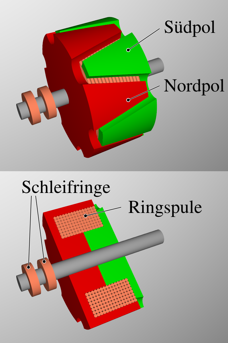 Es handelt sich um eine Klauenpolmaschine, welche anfänglich den noch niedrigen Drehzahlen höherpolige Synchrongeneratoren für die sich durchsetzende Standardfrequenz 50 Hz erforderten. Einzelpolwicklungen und deren Isolierungen mit den damals zur Verfügung stehenden Materialien benötigten erheblich mehr Raum als später und höhere Drehzahlen mit niedrigerer Polzahl waren noch nicht möglich. Konzentrisch um die Generatorwelle wurde nur eine Spule gewickelt, die aufgrund der Induktionsgesetze z.B. links den magnetischen Nordpol mit den austretenden (hier rot) und rechts den Südpol mit den eintretenden Feldlinien (hier grün) bildete. Über die "Klauen" wurde das rotierende Magnetfeld (N / S abwechselnd) in den Stator mit erheblichen Streufeldern geleitet (Grafik, Quelle *6). Was ist nun eine dreiphasig verkettete Wechselspannung, die einen ebenfalls dreiphasig verketteten Wechselstrom durch einen dafür geeigneten Verbraucher wie einen Motor treiben kann und vom AEG-Chefingenieur Michael O. von Dolivo-Dobrowolsky "Drehstrom" genannt wurde? Und wie wird die Spannung erzeugt?
