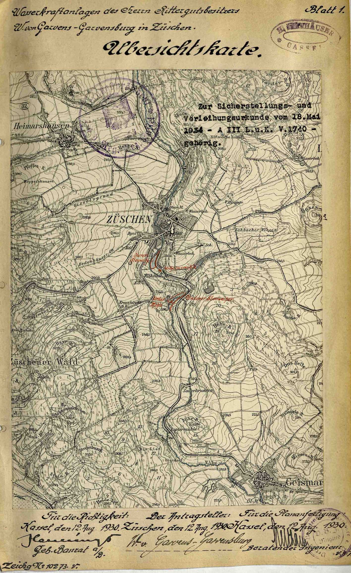 In Züschen existierten mit der Mahlmühle Leithäuser (ihr entstammt als Sohn der sehr erfolgreiche Inhaber des Kasseler Ingenieurbüros Leithäuser) und der Mahl- und Schneidemühle Schmalz (sog. Ober-Mühle) zwei Wasserableitungen aus der Elbe oberhalb Züschens. Auf Antrag von Wilhelm Garvens und der Bewilligung des Fürstentums Waldeck kamen 1893 mit der "Wilhelmsmühle" (s. Zeichnungsausschnitt rechts bzw. oben mit der "Knop"-Turbine, Quelle *3) und 1907/08 der "Turbinenanlage am unteren Stauweiher" zwei weitere hinzu. Vermutlich waren aber durch die politischen Umwälzungen von der Zeit des Fürstentums Waldeck bis hin zum Deutschen Reich in 1930 behördliche Akten zu Wasserrechten für die Turbinenanlagen und sonstigen Wassernutzung entweder nicht mehr auffindbar oder sogar verloren gegangen und der seinerzeitige Bauherr Wilhelm von Garvens-Garvensburg war 1913 verstorben.