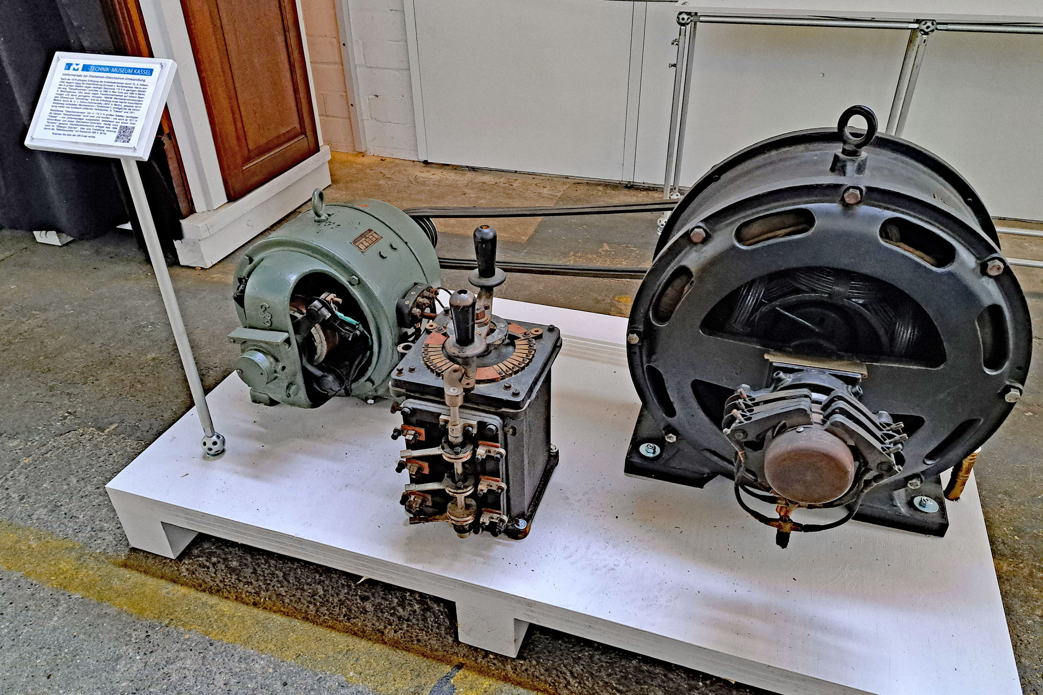 Erst der 1891 auf der Internationalen Elektrotechnischen Ausstellung (IEA 1891) in Frankfurt von der AEG mit Michael O. v. Dolivo-Dobrowolsky vorgestellte Drehstrom, seinerzeit mit 40 Hz, ermöglichte weitgehend verschleißfreie Motoren, im Gegensatz zu den etablierten Gleichstrom-Motoren wirtschaftlich jedoch nur in Drehzahlstufen wie z.B. 1 : 2 (Dahlanderschaltung) darstellbar, stufenlos in einem begrenzten Drehzahlbereich über Widerstände verlustbehaftet im Stator- oder Rotorkreis. Aber bestehende und neue Anlagen mit 110 V und weitgehend in Drehzahl (Ankerspannung) und Drehmoment (Reihen- oder Nebenschluss-Schaltung bzw. Feldstromreduzierung) verstellbaren Gleichstrommotoren mussten weiterversorgt werden können. So entstanden rotierende Umformersätze mit antreibenden Drehstrommotoren und Gleichstrom erzeugenden Dynamomaschinen für unterschiedlichste Betriebsweisen. Rechts bzw. oben ist der Drehstrom-Schleifringläufermotor von E-AG in Nürnberg von der Schleifringseite abgebildet. Die Anschlüsse führten zum Anlasser in der Mitte des Bildes darüber.