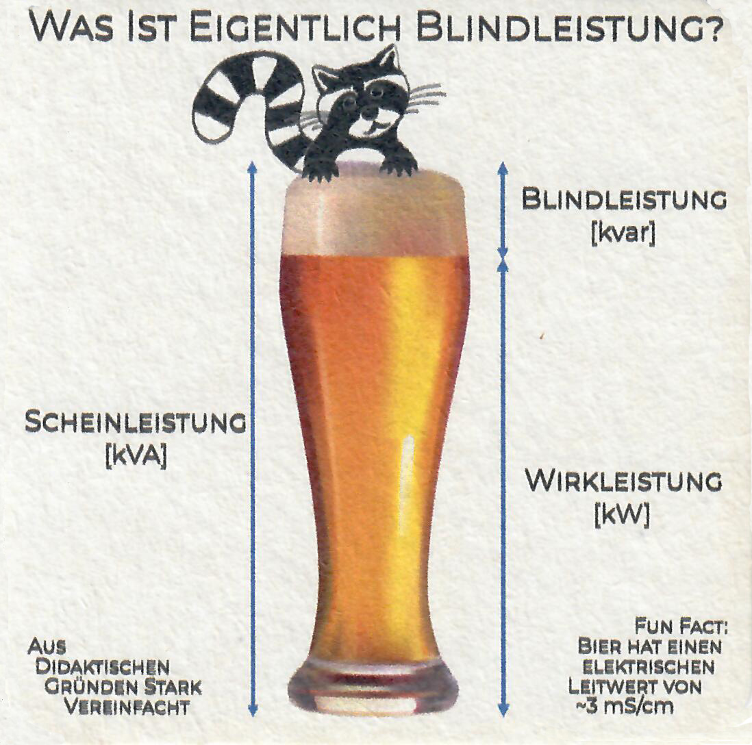 Sicherlich für einen Nicht-Elektrotechniker wirklich nicht einfach, aber dafür hat die Hochschulgruppe des VDE-Bezirksvereins Kassel e.V. am Fachbereich Elektrotechnik/Informatik der Universität Kassel eine Lösung parat, die nicht ganz so korrekt ist wie sie sein sollte, schon gar nicht technisch-wissenschaftlich wie es sich für Studenten und ausgebildete Ingenieure der Elektrotechnik gehört! Aber dafür ist sie insbesondere abends in der Hauptstadt der Waschbären eine sehr einleuchtende Alternative. Wenn man lange genug hinschaut sieht man immer mehr dieser putzigen Wesen, der liefernde Schankwirt hat aber auch eine durchaus passende Erläuterung: Schaum ist auch Bier und keineswegs Blindleistung!
