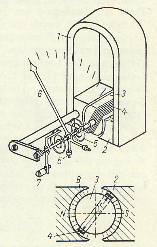 Die Grafik links bzw. oben (Quelle*3 ) zeigt ein typisches Drehspulmessinstrument, welches je nach Erweiterung durch Shunt und Vorwiderstände (s. weiter unten) für Ströme und Spannungen in weiten Messbereichen verwendet wurde, teilweise noch wird. Innerhalb eines Hufeisenmagneten "1" mit Polschuhen "2" ist auf einem Polkern "3" eine Drehspule "4" drehbar gelagert. Der Hufeisenmagnet lässt, von seinem Nordpol "N" ausgehend, ein Magnetfeld über den linken Polschuh, den Polkern, damit auch die Drehspule und mit Feldlinien einwirken, welche beim Südpol "S" wieder eintreten. Der Polkern besteht aus Weicheisen, weil dieses Material nicht magnetisierbar ist und die Feldlinien nur hindurchtreten lässt und damit keine dauerhafte Wirkung ausübt. Die Drehspule bekommt die Messgröße Strom oder Spannung durch zwei gegenläufig gewickelte Spiralfedern "5" zugeführt. Auch eine zu messende Spannung ist durch den Spulenwiderstand – und ggf. einen Vorwiderstand – bestimmt immer ein Strom. Die Spiralfedern üben ein sog. Richtmoment auf den drehbaren Polkern und den Zeiger "6" aus, welches durch die Stellschraube "7" so beeinflusst werden kann, dass der Zeiger ohne anliegende Messgröße auf Skalenstellung "0" steht.