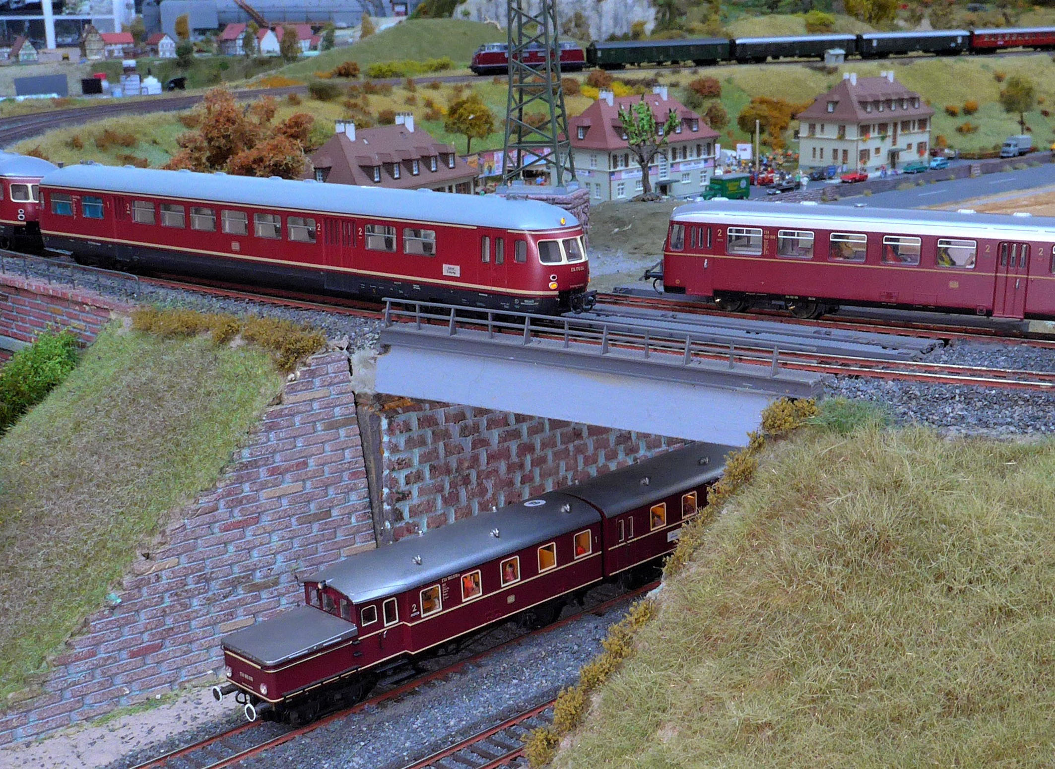 Bild L03 - Akkutriebwagen der Typen ETA 176 ETA 150 u. ETA 177 auf der Moba Bebra58 im TMK Bebra - Göttinger Bogen- Brücke - im Hintergrund auf der Cornberger Rampe D-Zug mit Diesellok V200 - Foto L1090880 Karl-Otto Schütz TMK IG Bebra58