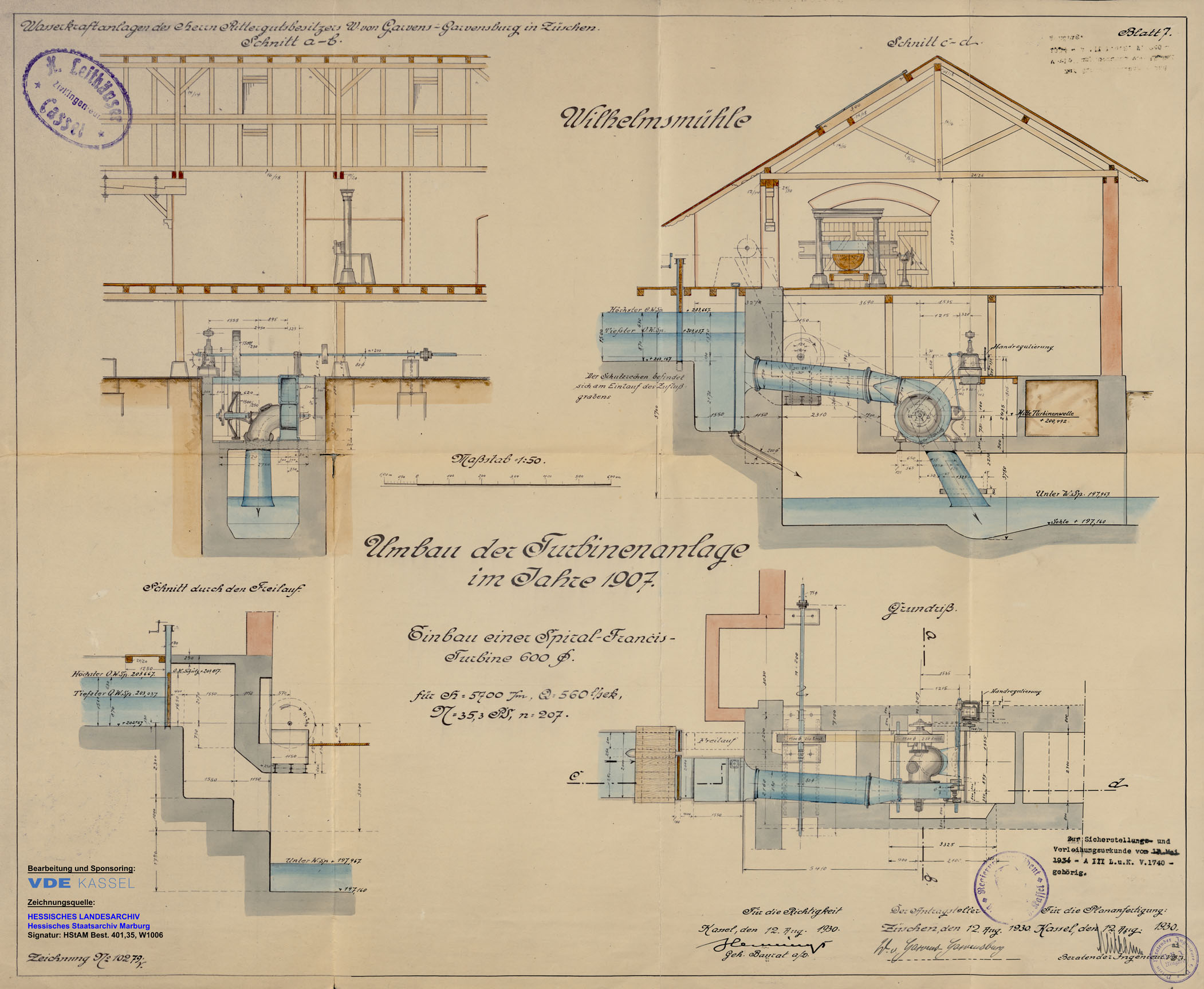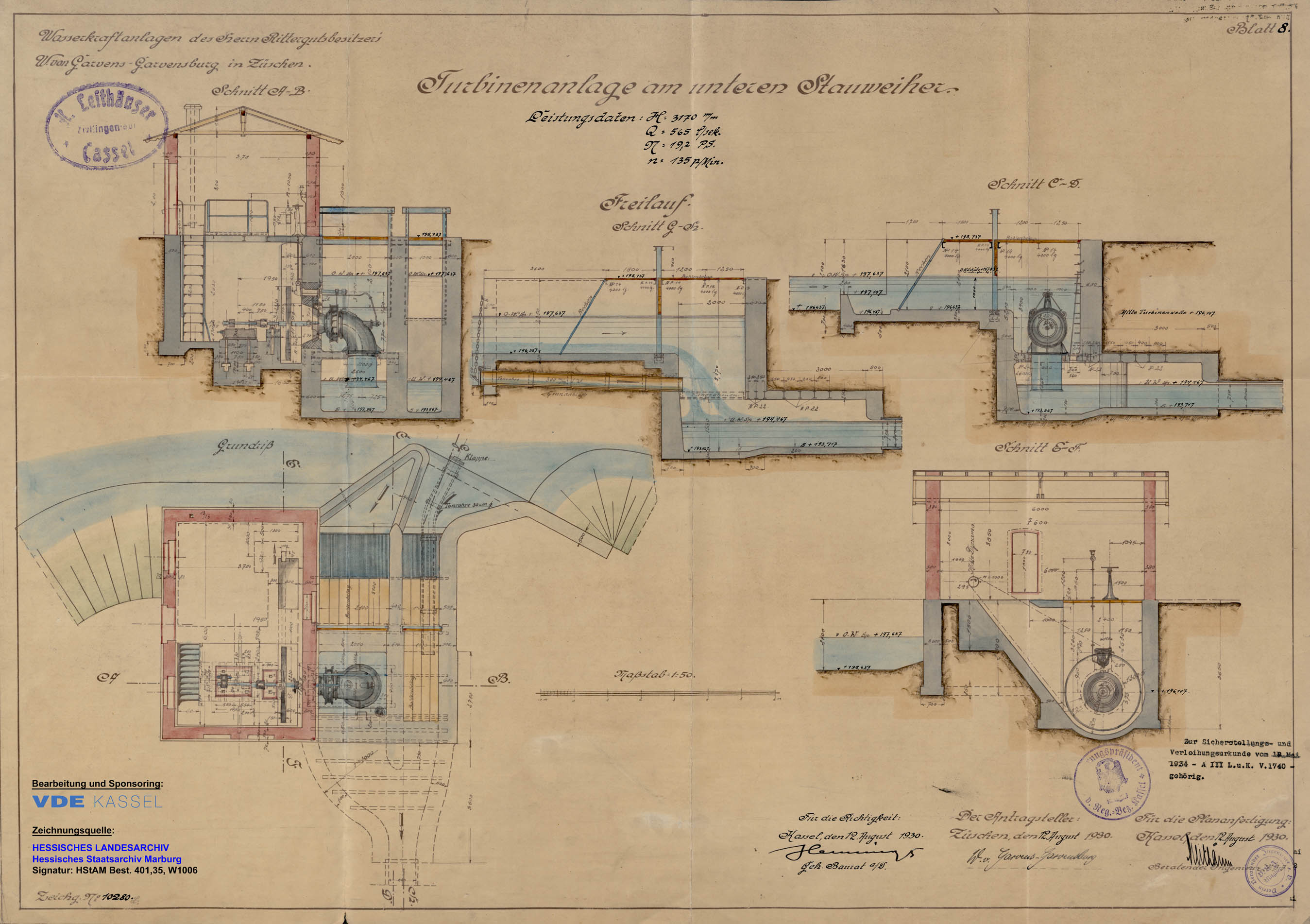 Die 1930 zur Sicherstellung bzw. (Neu-)Verleihung der ehemals waldeckischen Wasserrechte an der nordhessischen "Elbe" vom Kasseler Ingenieurbüro H. Leithäuser erstellte Zeichnung mit Wasserführung und Turbine mit Drehzahlregelung, jedoch ohne Darstellung von Generator und zugehöriger Schalttafel (Quelle *5)