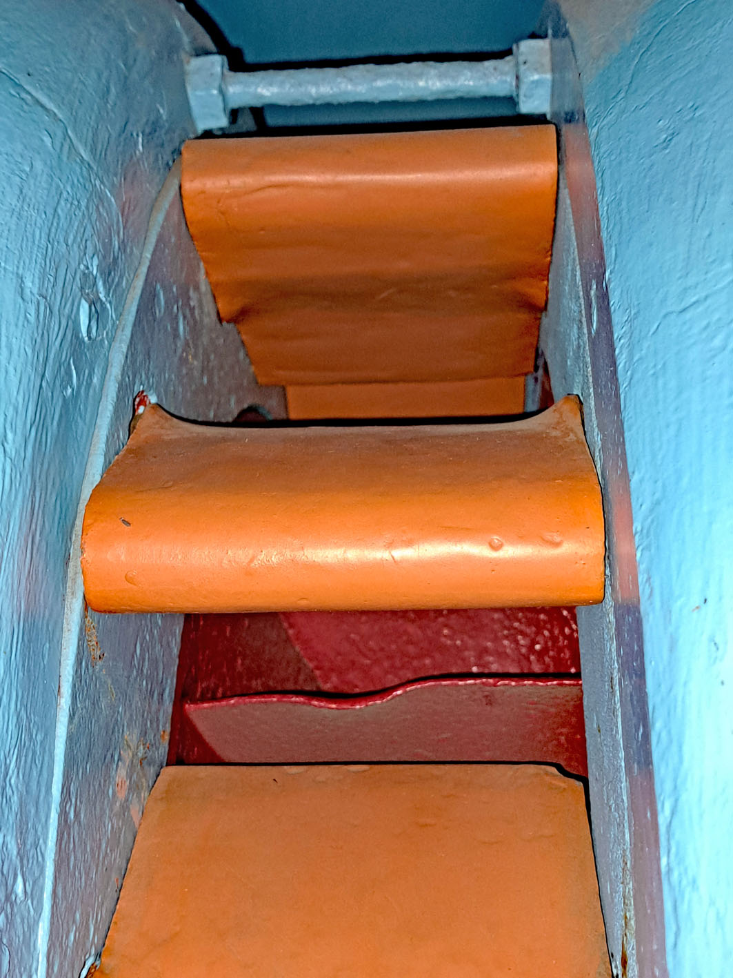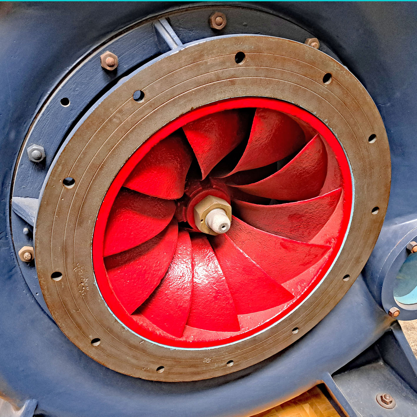 Ein tiefer Blick in den "Schlund" der Francis-Wasserturbine: Durch den kreisförmigen Anschlussflansch strömt das Wasser mit bis zu 565 Litern je Sekunde in die Spirale, welche sich von oben bis zum unteren Abschluss entsprechend dem radialen Fluss über die Leitschaufeln auf das Laufrad gleichmäßig verjüngt. Die orangefarbenen Teile sind die verstellbaren Leitschaufeln, die beiden roten Teile sind die die Schaufeln am Laufrad. Dass das fließende Wasser auf die Schaufeln Kräfte ausübt ist an den Verformungen zu erkennen.