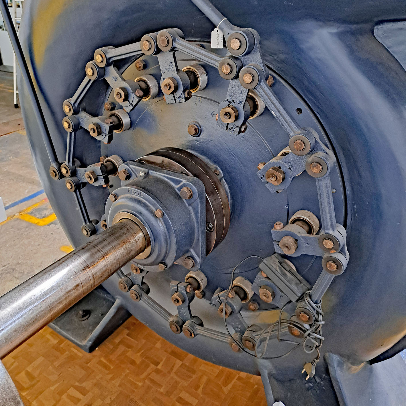 Der Blick auf die Verstellmechanik zeigt, dass zwölf Leitschaufeln gleichzeitig zu verstellen sind. Dies bedeutet auch Wartungsaufwand: Es muss geschmiert werden, alle Befestigungen sind zu überprüfen, der Maschinist hatte gut zu tun!