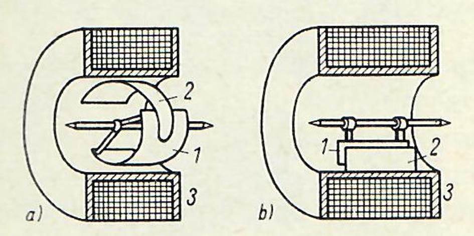 Die Grafik rechts bzw. oben (Quelle*3 ) zeigt mit der Anordnung und Form der Bleche in a) ein Mantelkern-, in b) ein Streifenkern-Messwerk. In einer Rundspule ist zentrisch ein drehbares Blech (1 ) angeordnet, welches beim Mantelkern-Messwerk von einem feststehenden Blech (2 ) umgeben ist bzw. dem beim Streifenkern-Messwerk ein feststehender Blechstreifen (2 ) gegenüber steht. Das drehbare Blech ist mit der Zeigerachse verbunden. Durch den die Rundspule durchfließenden Strom werden in jedem Messwerk beide Bleche gleichsinnig magnetisiert, sodass sie sich voneinander abstoßen. Dies ermöglicht die Messung von Gleich- und Wechselströmen. Im oben erwähnten Artikel 6 zur Haupt-Schalttafel im Rittergut wurde zu den Messgeräten Nr. 5 und 9 der "E-AG" erwähnt, dass auf der Skala "System Hummel" vermerkt ist. Diese zeichneten sich durch die sehr geringe Masse von lediglich 0,3 g Eisen für das drehbare Blech aus. Ob die Instrumente unseres Exponats so ausgestattet sind ist höchstwahrscheinlich, denn das Patent wurde Georg Hummel bereits 1884 erteilt.