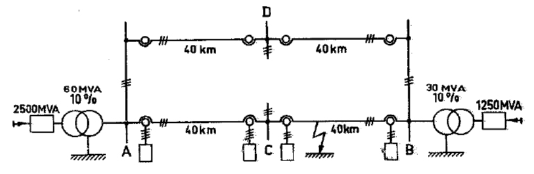 Im oben vereinfacht dargestellten Hochspannungsnetz (Quelle *1) speisen zwei Kraftwerke ein Maschennetz, in dem zwischen den unteren Verknüpfungspunkten C und B ein Kurzschluss zur Erde entsteht, z. B. durch Blitzeinschlag und entstehenden Lichtbogen zum geerdeten Leitungsmast. Durch die Schutzrelais der beteiligten Schaltanlagen in A, B, C und D ist sicherzustellen, dass nur die Leitung zwischen C und B abgeschaltet wird und alle Verbraucher, die von den vier Schaltanlagen versorgt werden, bis auf ein kurzes Flackern des Lichts von dem Blitzeinschlag und Kurzschluss nicht beeinträchtigt werden.