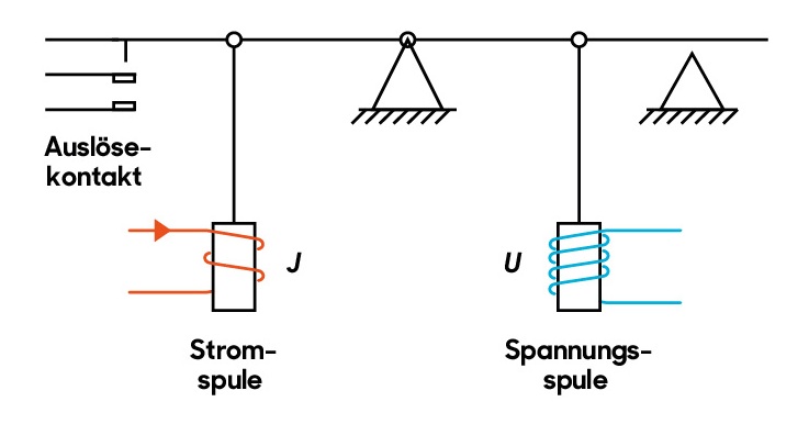 An der rechten Spannungsspule liegt – selbstverständlich über Wandler gemessen, z. B. 110 / 0,1 kV – die am Ort der Messung noch vorhandene Spannung U an, welche umso geringer ist je näher sie am Ort des Kurzschlusses liegt. In der linken Stromspule fließt – ebenfalls über Wandler gemessen, z. B. 500 / 5 A – der Kurzschlussstrom J. Solange kein Kurzschluss besteht, also z. B. die sekundäre Wandlerspannung 100 V anliegt, wird durch ihre elektrotechnische Auslegung die Spannungsspule den Waagebalken nach unten bis an den Anschlag ziehen sowie die Stromspule durch den normalen Betriebsstrom keine Auswirkung haben. Fließt aber ein Kurzschlussstrom, bricht die Spannung weitgehend zusammen und die Stromspule gewinnt am Waagebalken die Überhand: Dieser wird also links nach unten gezogen und betätigt den Auslösekontakt, der entsprechende Leistungsschalter in der Station kann also den Kurzschlussstrom abschalten.