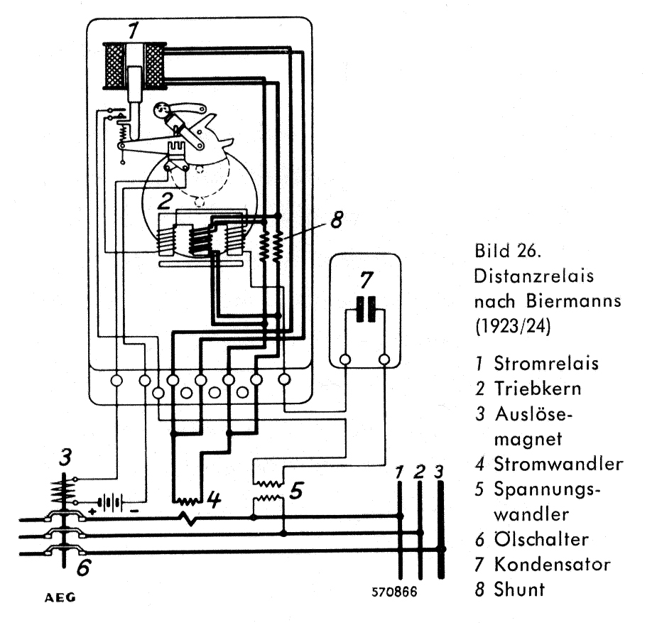 U. a. nutzte Prof. Dr.-Ing. e.h. Josef Biermanns dies in seinem 1923/24 vorgestellten Distanzrelais (Grafik links bzw. oben, Quelle *2), welches noch keine Zeitstufen kannte und außer der Ferrarisscheibe als entscheidendem Bauteil für die Entfernungsbestimmung noch ein Anregerelais für den Kurzschlussstrom beinhaltete. J. Biermanns kam nach dem Zweiten Weltkrieg nach Nordhessen, wohnte zunächst in Helsa, später in Kassel-Harleshausen und war der Leiter des AEG-Hochspannungsinstituts in der Lilienthalstraße in Kassel-Bettenhausen.