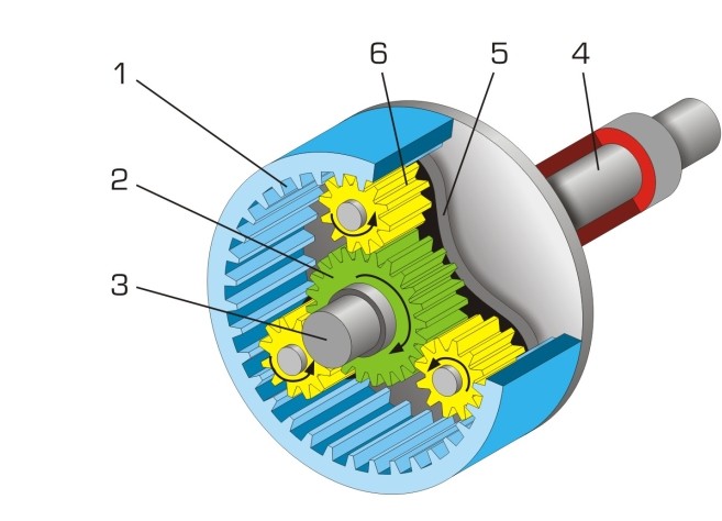 1 = Hohlrad, 2 = Sonnenrad, 6 = Planetenräder