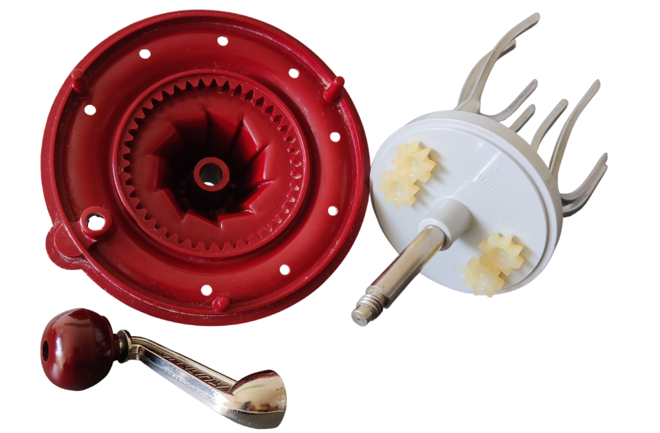 | Modell B | wie A, jedoch Getriebegehäuse und Behälter aus Kunststoff. Fassungsvermögen des Behälters 1 Liter. Später wurden auch Kurbel und Rührstäbe aus Kunststoff gefertigt. Als Zubehör wurde ein zusätzlicher Deckel mit integriertem Dottertrenner angeboten, der auch an das Modell C passte. Zeitweise wurden beide Artikel als Set verkauft. | ![]() |