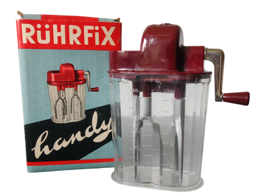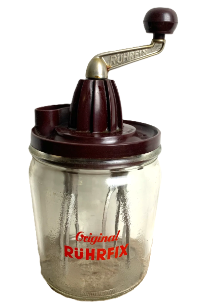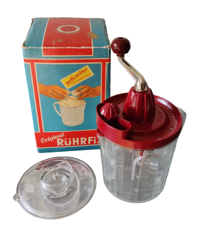 Das Ergebnis dieser Konstruktion war der Rührfix, ein universeller Küchenhelfer, mit dem man verschiedene Lebensmittel verarbeiten konnte, wie Schaumspeisen, Schlagsahne, Buttercreme, Eischnee, Mayonnaise, Eierspeisen, leichte Kuchenteige, Mischgetränke und vieles mehr. Ich erinnere mich, dass meine Mutter damit Eierlikör herstellte, den ich als Kind leider nicht kosten durfte. Aber das war noch nicht alles, was der Rührfix konnte. Mit etwas Zubehör wurde mit wenigen Handgriffen aus dem Rührfix eine Zitruspresse, ein Dottertrenner oder ein Aufbewahrungsgefäß mit Deckel.